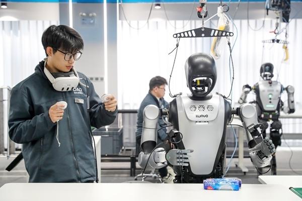 3月18日,山东省青岛市人形机器人数据采集训练场,一名00后数据采集员在工业场景中指导机器人进行日用品的分拣。