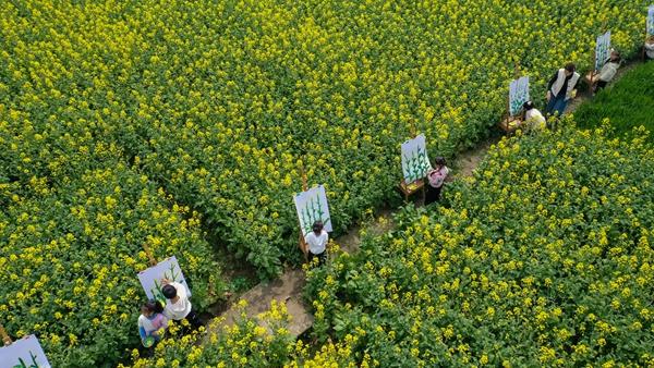 3月25日,江苏南通如皋市下原镇下原幼儿园的孩子们在油菜花田用画笔描绘油菜花、蓝天与春光。视觉中国供图