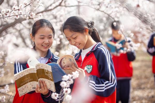 3月25日,山东淄博,山东省淄博市高青县第五中学开展“杏花节”主题活动,学生在杏花树下读书。视觉中国供图