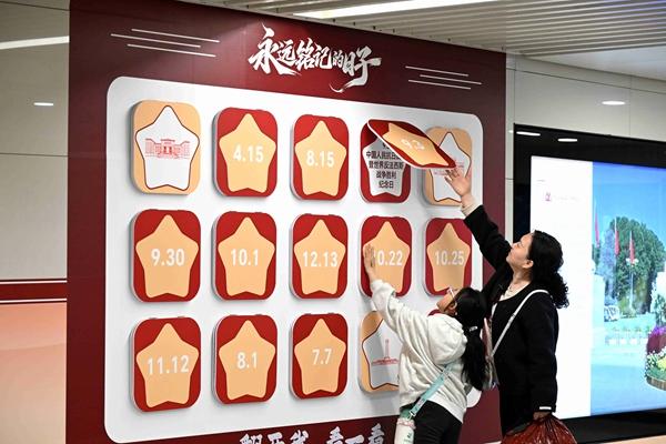 3月28日,乘客在石家庄市的华北军区烈士陵园崇尚英烈主题地铁站观看红色主题展示墙。日前,华北军区烈士陵园与石家庄市轨道交通集团有限责任公司携手打造的以“崇尚英烈”为主题的烈士陵园地铁站正式亮相。这座地铁站将红色文化融入城市公共空间,通过沉浸式展陈、互动式体验和庄重氛围营造,打造出一个弘扬英烈精神、厚植爱国情怀的“红色课堂”。陈其保/摄(新华社发)