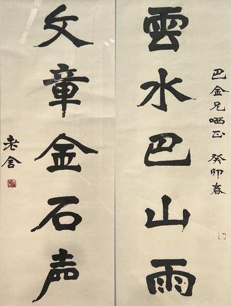 尤为可贵的是,老舍以“巴金”嵌名联中。云水之柔与金石之刚,巴山地域之情与文章永恒之声,形成一种辩证统一的美学表达。