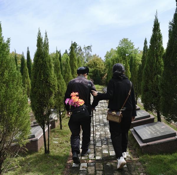4月4日,江西省于都县烈士纪念园,87岁的袁二长(左)在女儿的陪伴下为父亲、红军烈士袁北长献上鲜花,进行祭扫。
