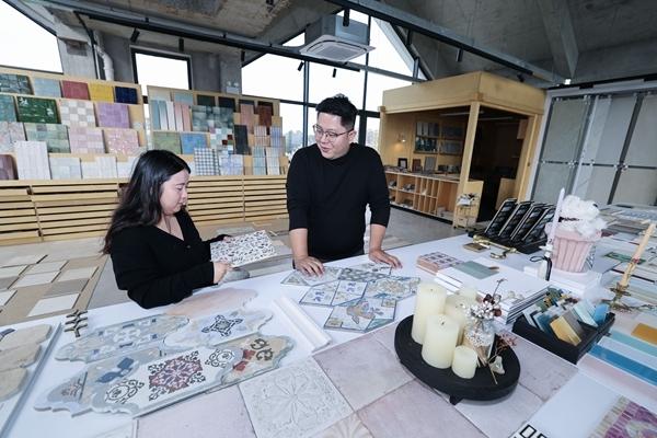 4月8日,浙江省嘉兴市南湖区余新镇长秦村千品创岩瓷砖工作室,负责人朱小冬(右)在研究瓷砖设计。