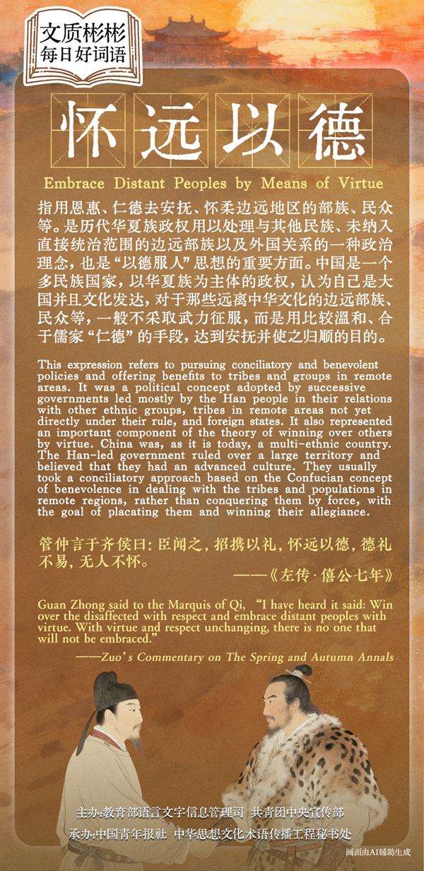 管仲言于齐侯曰:臣闻之,招携以礼,怀远以德,德礼不易,无人不怀。(《左传·僖公七年》)(管仲对齐侯道:臣听说,招抚尚未归顺的诸侯,用礼;安抚边远地区的部族、民众,用德。不违背德和礼,没有人会不归附。)