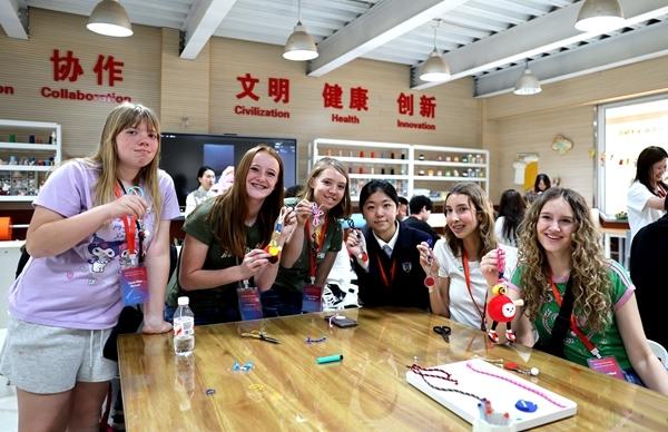 4月11日,美国学生在石家庄外国语学校展示手工课作品。