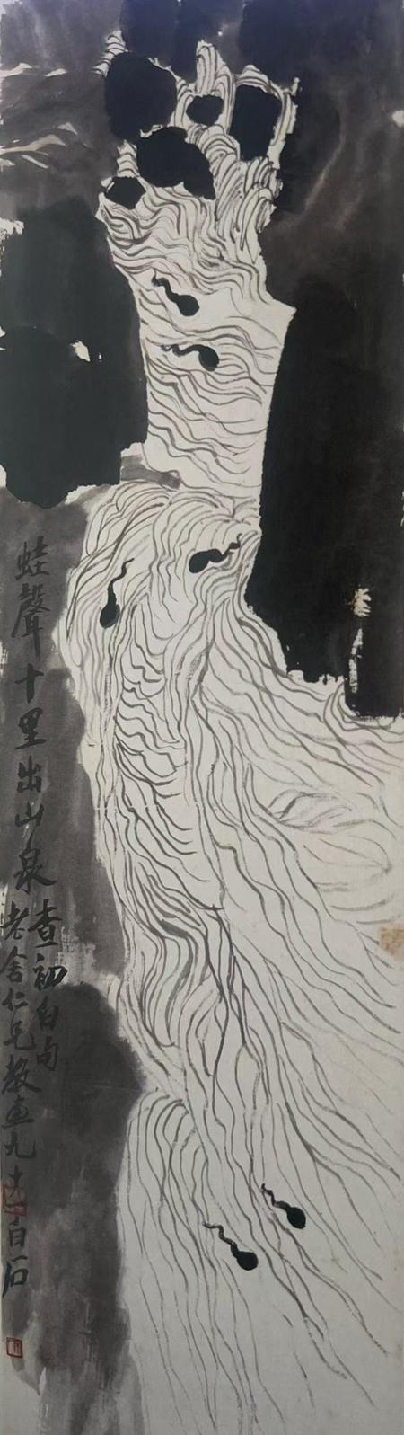 中国绘画历来重视“计白当黑”的美学原则,齐白石在《蛙声十里出山泉》中将这一传统智慧发挥得淋漓尽致。画面仅以淡墨挥洒出峡谷轮廓,一道蜿蜒的清泉自右上方向左下方流淌,6只蝌蚪顺流而下,不见青蛙踪影,却令人仿佛听闻十里蛙声。
