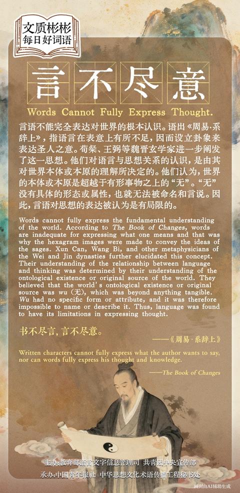 言语不能完全表达对世界的根本认识。语出《周易·系辞上》,指语言在表意上有所不足,因而设立卦象来表达圣人之意。荀粲、王弼等魏晋玄学家进一步阐发了这一思想。 他们对语言与思想关系的认识,是由其对世界本体或本原的理解所决定的。他们认为,世界的本体或本原是超越于有形事物之上的“无”。“无”没有具体的形态或属性,也就无法被命名和言说。因此,言语对思想的表达被认为是有局限的。