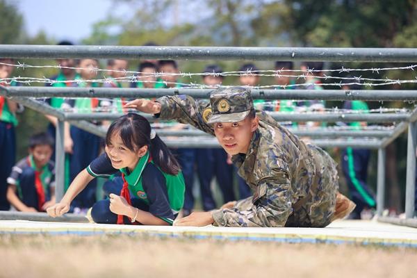 近日,武警海南总队儋州支队执勤六中队邀请五指山市毛阳中心学校师生走进军营开展“薪火相传守初心 军地共建护国安”全民国家安全教育活动,普及国家安全与国防知识,增强青少年爱国拥军意识,巩固军政军民鱼水情。图为学生在官兵带领下钻爬战术网,体验军事训练。王翔宇/摄