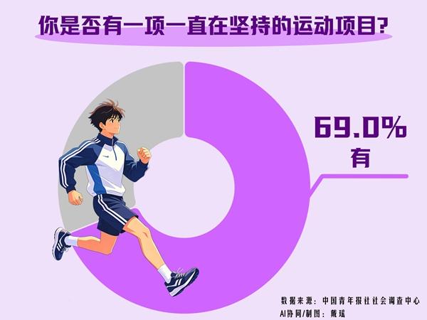 计划跑步却因为加班放弃、打算打球却苦于球友难寻、想要健身周围却没有场地……决定长期坚持一项运动时,年轻人经常会面对各种各样的阻力。近日,中国青年报社社会调查中心联合问卷网(wenjuan.com)进行的一项1333人参与的调查显示,69.0%的受访青年有一项一直在坚持的运动项目。不够自律、工作或学习太忙、没有同伴或运动搭子是导致受访青年放弃运动的主因。