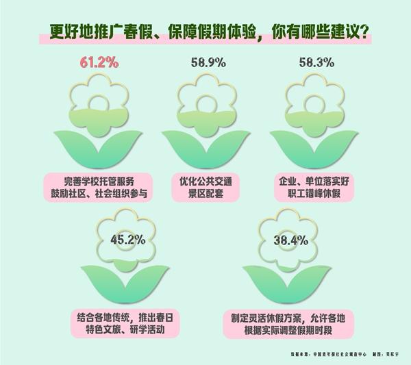 更好地推广春假、保障假期体验,受访青年有哪些建议?数据显示,超六成(61.2%)受访青年希望完善学校托管服务,鼓励社区、社会组织参与;58.9%的受访青年期待优化公共交通、景区配套,应对春假出行需求;58.3%的受访青年希望企业、单位落实好职工错峰休假。其他还有:结合各地传统,推出春日特色文旅、研学活动(45.2%);制定灵活休假方案,允许各地根据实际调整假期时段(38.4%)等。