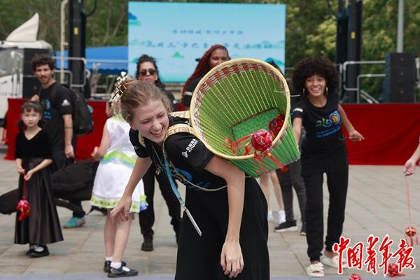 4月16日,广西南宁,巴西友人与中国青少年共同参加抛绣球民俗活动。