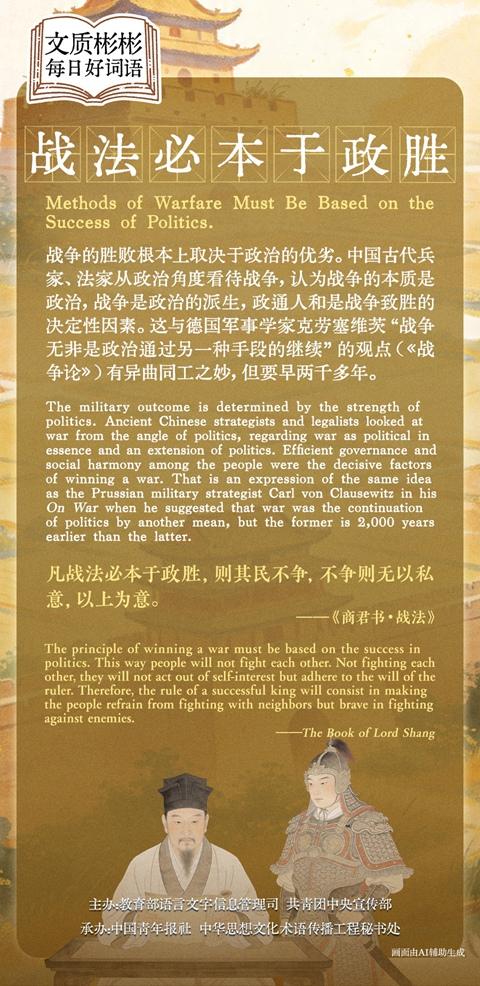 战争的胜败根本上取决于政治的优劣。中国古代兵家、法家从政治角度看待战争,认为战争的本质是政治,战争是政治的派生,政通人和是战争致胜的决定性因素。这与德国军事学家克劳塞维茨“战争无非是政治通过另一种手段的继续”(《战争论》)的观点有异曲同工之妙,但要早两千多年。