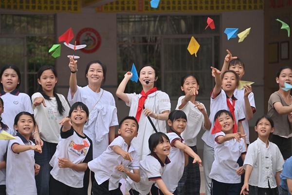 4月16日,在广西梧州市长洲区倒水镇大桥小学,送教老师和学生一起放纸飞机。
