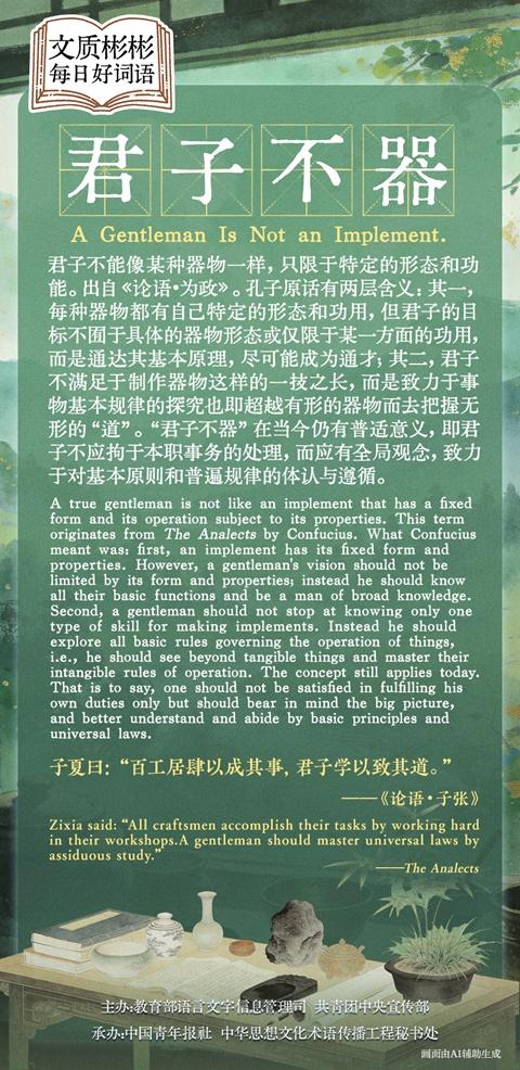 A true gentleman is not like an implement that has a fixed form with its operation subject to its properties. This term originates from The Analects by Confucius. What Confucius meant was: first, an implement has its fixed form and properties. However, a gentleman's vision should not be limited by its form and properties; instead he should know all its basic functions and be a man of broad knowledge. Second, a gentleman should not stop at knowing only one type of skill for making implements. Instead he should explore all basic rules governing the operation of things, i.e., he should see beyond tangible things and master their intangible rules of operation. The concept still applies today. That is to say, one should not be satisfied with fulfilling his own duties only but should bear in mind the big picture, and better understand and abide by basic principles and universal laws.