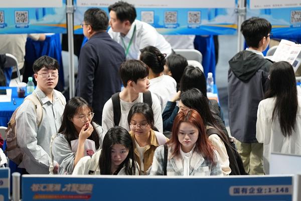 4月18日,求职者在招聘会现场查看岗位需求。当日,“智汇潇湘 才聚湖南”2026年促进高校毕业生就业创业行动暨全省联动综合性招聘活动启动。活动为期两天,在湖南大学和湖南师范大学设置主会场,在岳阳、衡阳、怀化设置分会场,在9所高校举办行业专场招聘会。新华社记者 陈振海/摄