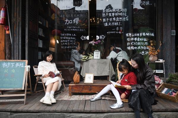 4月11日,四川省阆中市,游客在阆中古城内的树下书栈读书休闲。近年来,阆中市持续推进“千年古城·万家书香”文旅共建全民阅读项目,在阆中古城院落、客栈、民宿、茶坊等区域因地制宜打造书院、书吧、书屋、书角等“主客共享”新型公共阅读空间100余个,并以此为依托开展丰富多彩的全民阅读活动,推动阅读成为人们的生活习惯和休闲方式。王玉贵/摄(新华社发)