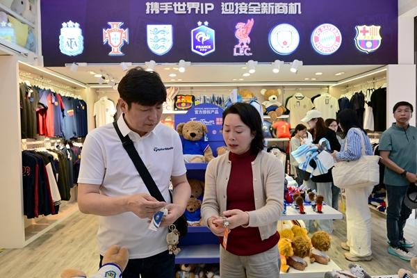 4月18日,浙江金华,义乌国际商贸城一家全球IP官方授权聚星动力商店内,韩国客商在洽谈采购美加墨世界杯相关周边商品。视觉中国供图