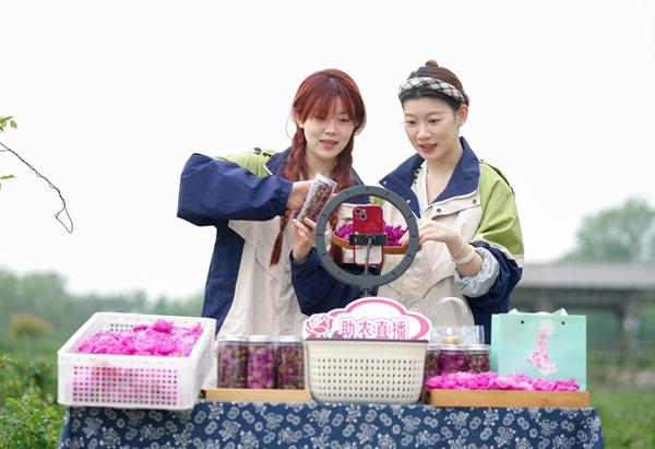 4月20日,浙江长兴,长兴县泗安镇中心幼儿园党员志愿者在泗安镇师姑岗村玫瑰园基地开展助农直播活动。视觉中国供图