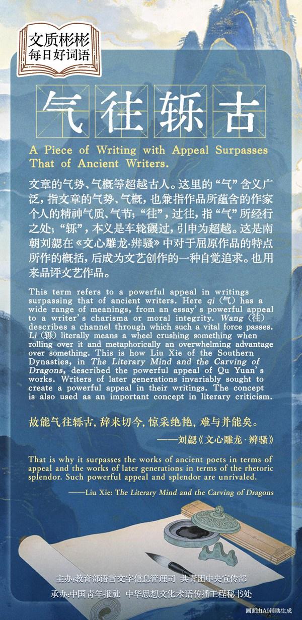 文章的气势、气概等超越古人。这里的“气”含义广泛,指文章的气势、气概,也兼指作品所蕴含的作家个人的精神气质、气节;“往”,过往,指“气”所经行之处;“轹”,本义是车轮碾过,引申为超越。这是南朝刘勰在《文心雕龙·辨骚》中对于屈原作品的特点所作的概括,后成为文艺创作的一种自觉追求,也用来品评文艺作品。
