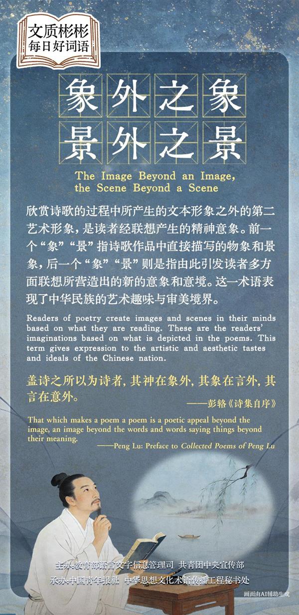 Readers of poetry create images and scenes in their minds based on what they are reading. These are the readers' imaginations based on what is depicted in the poems. This term gives expression to the artistic and aesthetic tastes and ideals of the Chinese nation.