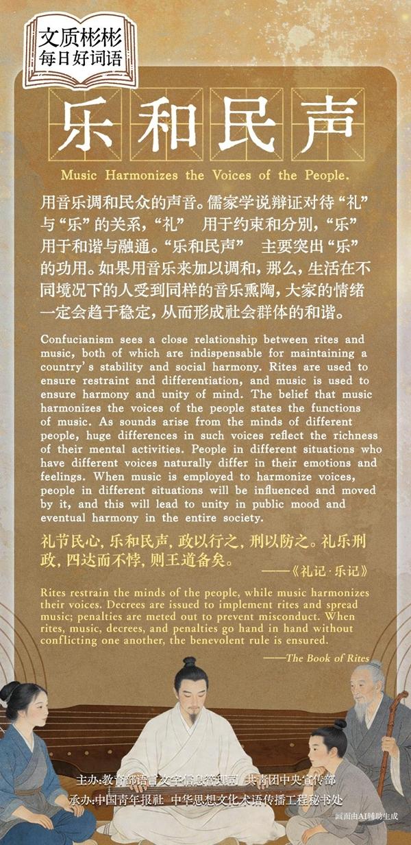 用音乐调和民众的声音。儒家学说辩证对待“礼”与“乐”的关系,“礼”用于约束和分别,“乐”用于和谐与融通。“乐和民声”主要突出“乐”的功用。如果用音乐来加以调和,那么,生活在不同境况下的人受到同样的音乐熏陶,大家的情绪一定会趋于稳定,从而形成社会群体的和谐。